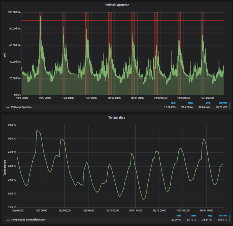 Em geral, os transformadores possuem uma especificação nominal de potência, valor no qual o transformador pode trabalhar continuamente, e ainda, uma especificação de fator de sobrecarga, que representa um percentual de sobrecarga aceito por um curto período de tempo, já prevendo eventuais picos de consumo. Na figura abaixo é possível observar como a alta exigência do transformador gera picos de temperatura do dispositivo.