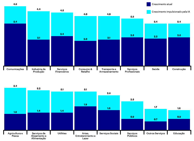A imagem a seguir mostra as taxas de crescimento anuais em 2035 do valor bruto acrescentado (aproximadas ao PIB), comparando a linha base de crescimento em 2035 com um cenário de inteligência artificial, onde a IA foi absorvida pela economia.