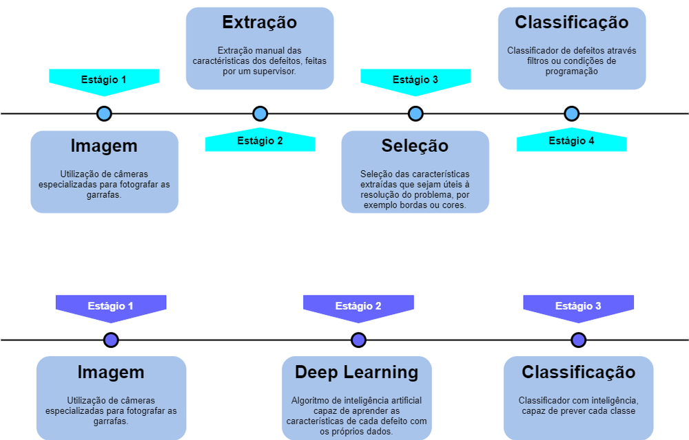 O uso da tecnologia de visão por máquina mostra-se como um verdadeiro aliado no controle de inspeção de qualidade de produtos em linhas de produção. Durante décadas, existem implementações que possibilitam analisar diversos produtos através de câmeras com algoritmos de processamento de imagem, onde um funcionário escolhe quais características são importantes para o problema, como arestas, cantos, cores, etc. A partir disso, definem-se regras através da extração manual de características que definem se há ou não problema no produto visualizado, tornando-se um método simples e consideravelmente eficaz.