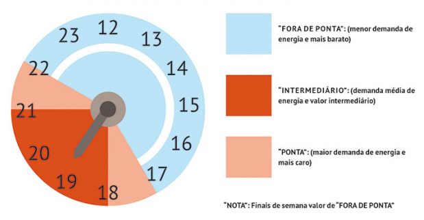 O horário de ponta é aplicado durante um período de 3 horas consecutivas, geralmente aplicado das 18:00 às 21:00, que é o horário de pico de consumo. O horário intermediário pode varias de 1h a 1h30 antes e depois do horário ponta. O horário fora ponta é aplicado em todo o restante do horário em dias úteis, e aplicado integralmente em dias não uteis.