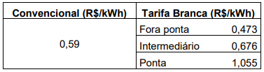 Para se ter uma ideia da diferença entre valores da tarifa convencional e da tarifa branca a tabela abaixo apresenta os valores utilizados pela concessionaria RGE Sul.