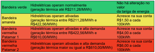 Outro fator que acresce na conta de energia elétrica são as chamadas bandeiras tarifárias, que são determinadas principalmente pelo nível dos reservatórios das hidrelétricas, quanto menor o nível dos reservatórios, maior a utilização de usinas termelétricas, e maior o adicional às contas de energia. A tabela a seguir apresenta esse aumento, com base na concessionaria RGE SUL.