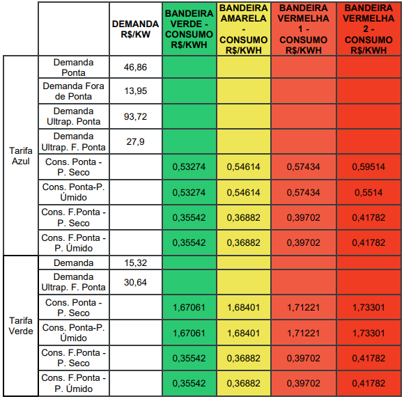 Para termos uma melhor noção das diferenças de valores para as tarifas verdes e azul é apresentada a tabela seguinte comparando os custos para a classe A4, conforme dados da Cemig Energia.