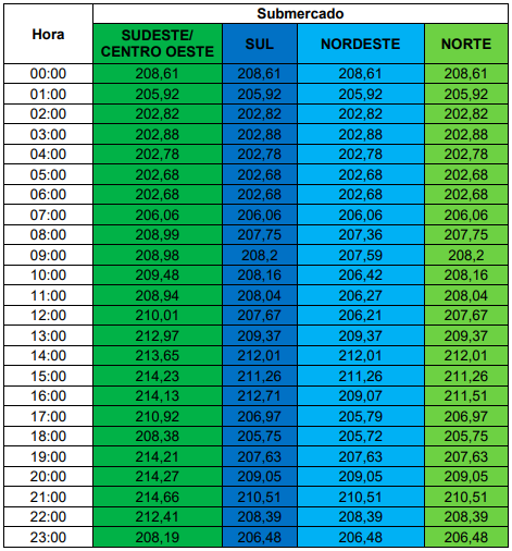 A partir do PLD que são definidos os valores da energia para cada submercado. Com base nesses valores que são fechados os contratos de compra e venda de energia no mercado livre. Até dezembro de 2020 o PLD era calculado semanalmente pelo CCEE, a partir de 2021 passa a ser calculado diariamente para cada hora do dia seguinte. A tabela abaixo apresenta os valores de PLD para o dia de hoje (21/01/2020), conforme dados da CCEE em 20/01/2020 as 22:00.